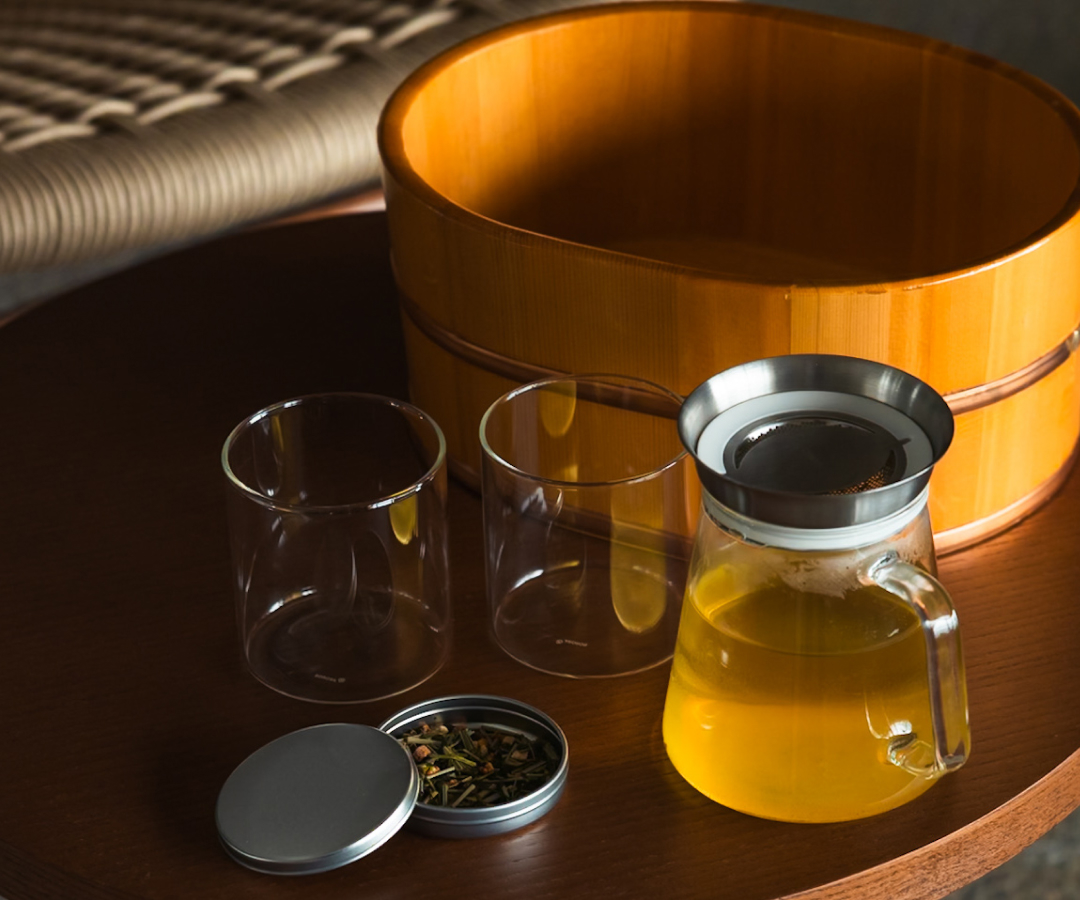 無料のルームサービスでは「茶出し風呂」をご用意。全室に備えた露天風呂で湯に浸かりながら、ドリンクや軽食をお楽しみいただけます。
